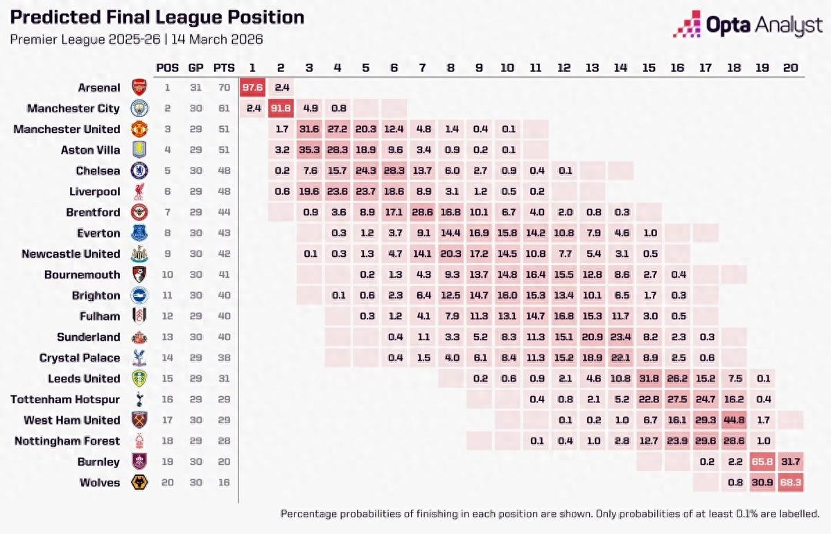 英超第30輪曼城客場戰平西漢姆聯後,Opta更新了超級計算機預測的奪冠概率,阿森納奪冠概率高達97.6%。