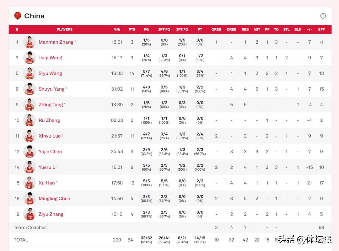 本場比賽,中國女籃四人得分上雙,王思雨14分3助攻,韓旭12分4籃板,楊舒予、羅欣棫各得11分。