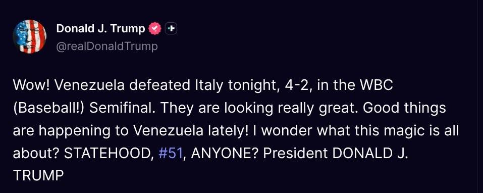 美國總統特朗普也在賽後湊了個熱鬧,他在個人社媒表示:“哇!委內瑞拉今晚在WBC半決賽4-2擊敗了意大利,他們看起來真的很棒,最近委內瑞拉一直有好事發生,我很好奇這種魔力來自於哪裏?讓他們成爲美國第51個州?有人感興趣嗎?”