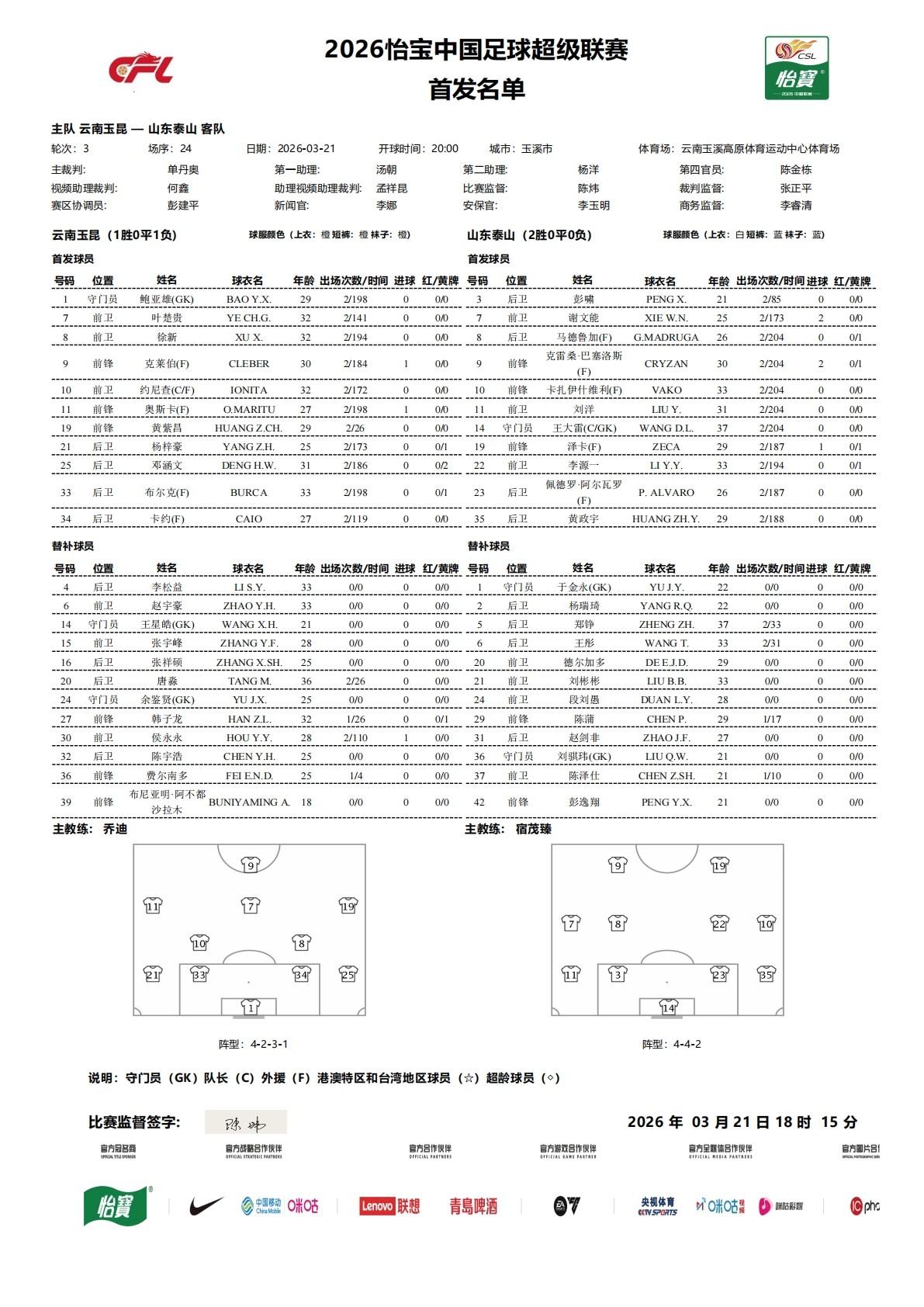 北京時間3月21日20:00,中超第3輪,雲南玉昆主場對陣山東泰山。賽前首發公佈。