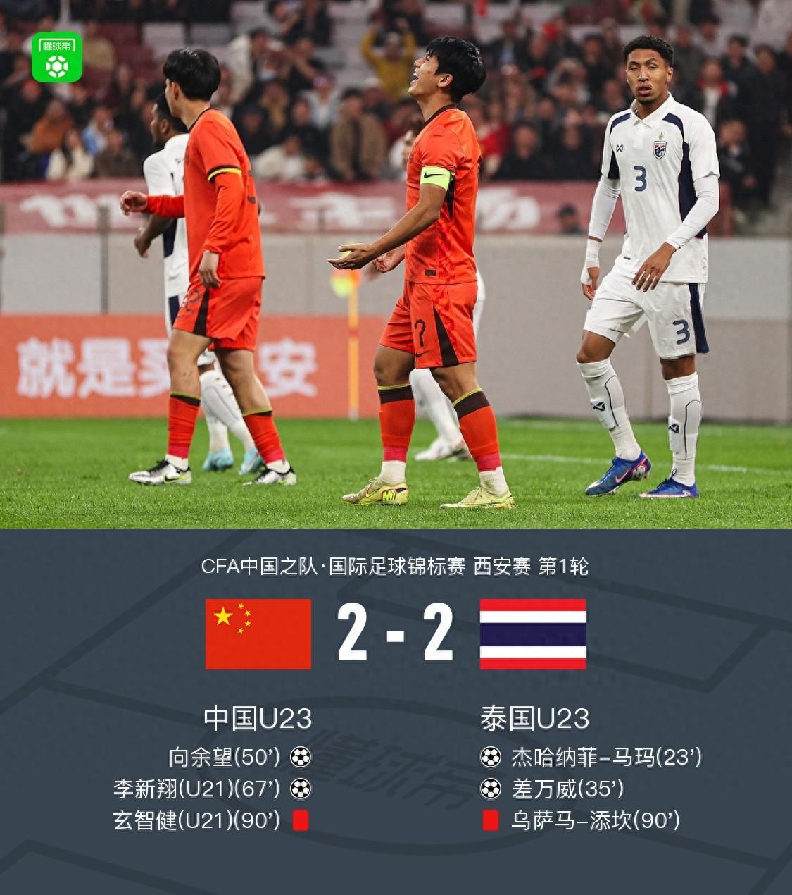 北京時間3月25日CFA中國之隊·國際足球錦標賽 西安賽 第1輪,中國U23對陣泰國U23。中國U23向餘望破門,李新翔破門。泰國U23傑哈納菲-馬瑪破門,差萬威破門。最終比分中國U23 2-2 泰國U23。