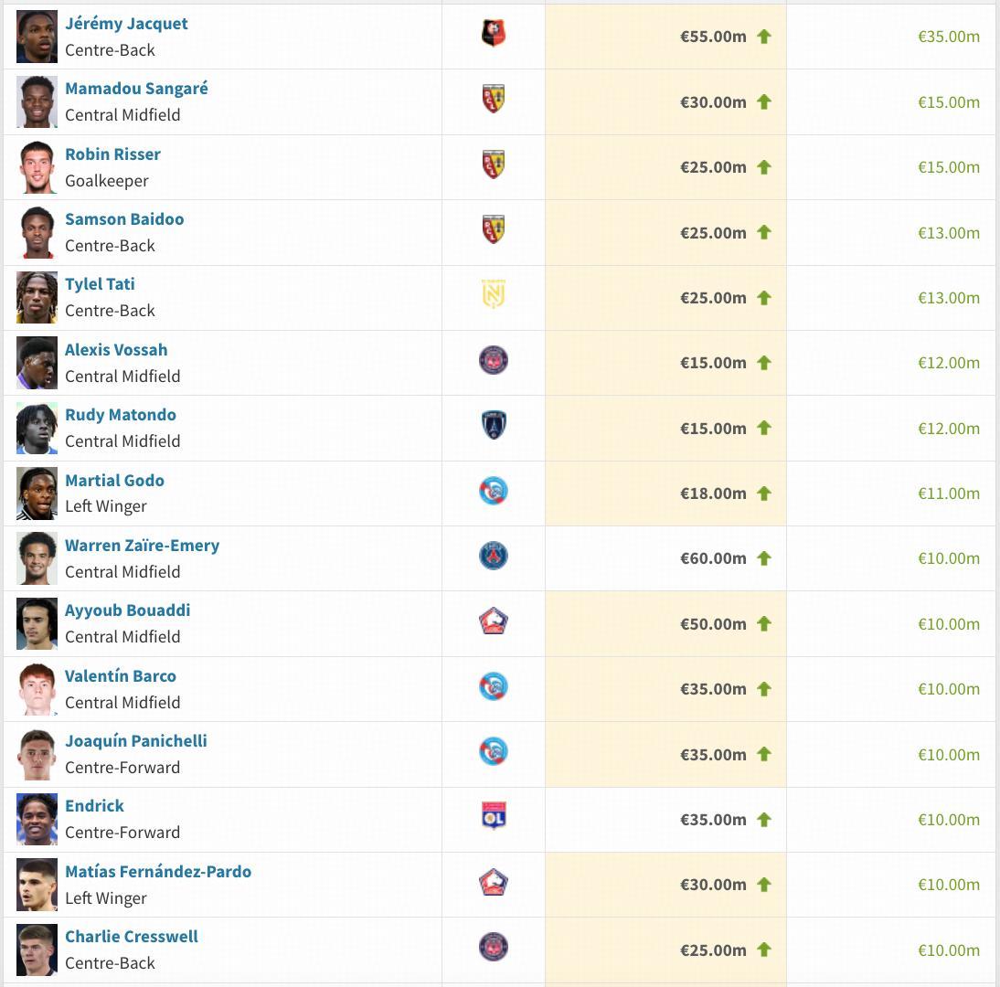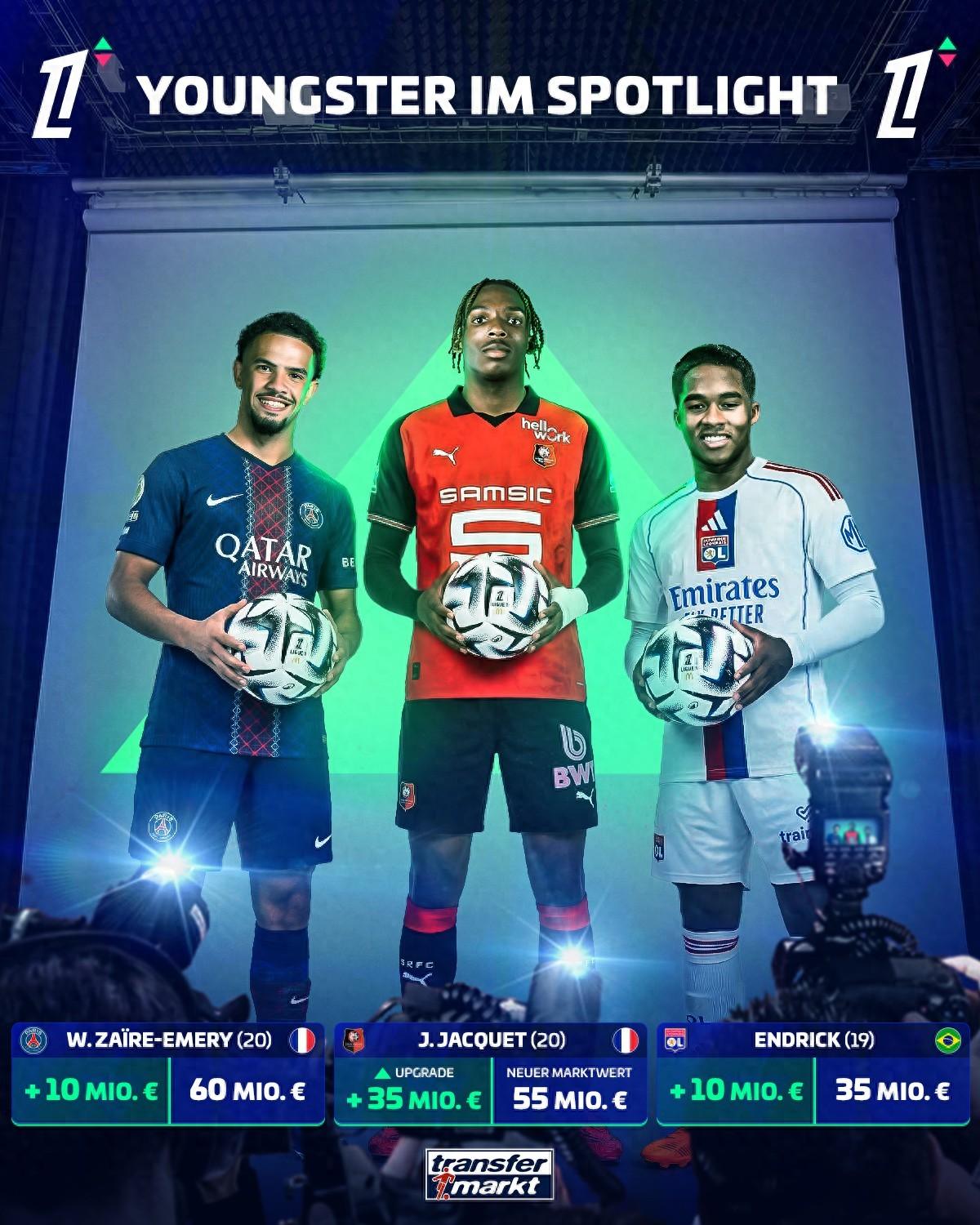 3月27日晚,德國轉會市場更新了187名法甲球員身價,其中今夏加盟利物浦的雷恩後衛雅凱暴漲3500萬歐,身價達到5500萬歐,皇馬租將恩德里克上漲1000萬歐。