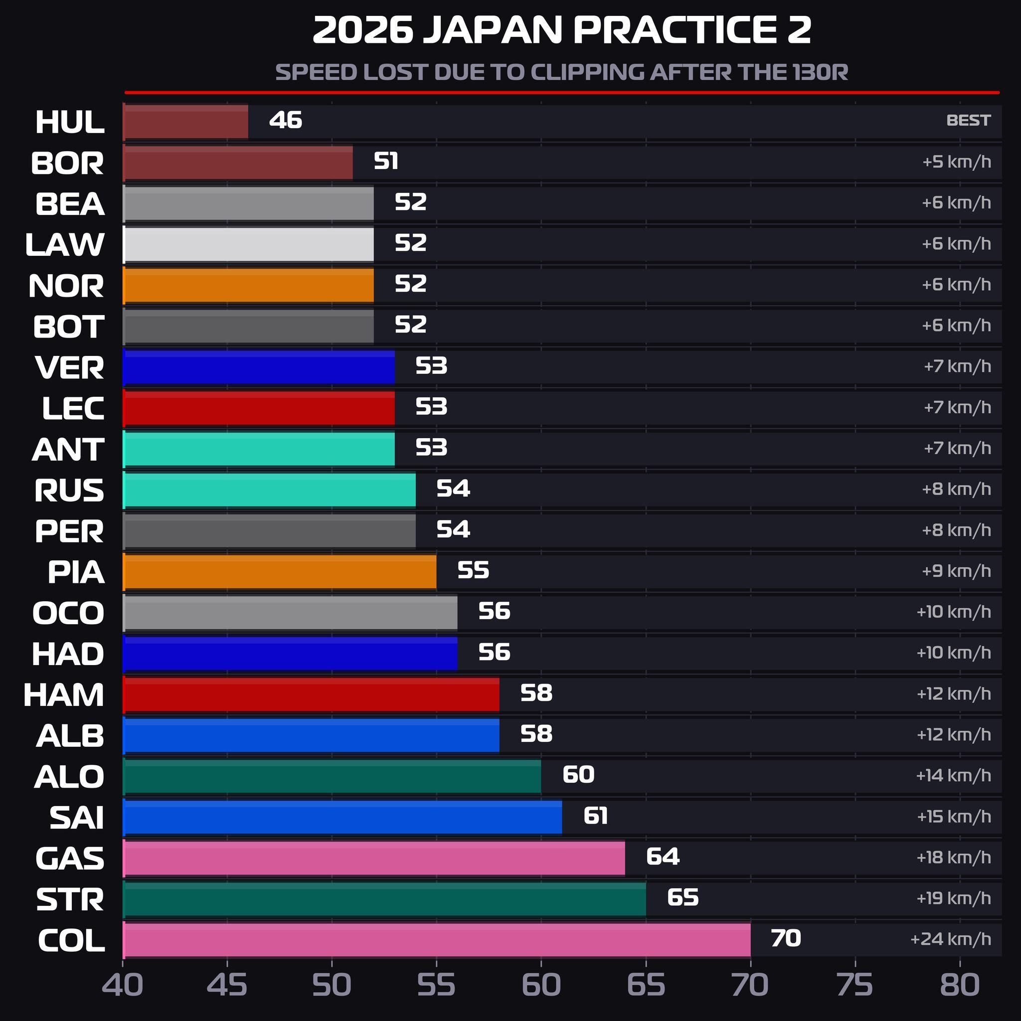北京時間3月27日,F1日本站週五兩節練習賽結束。據遙測數據顯示,大量車手在鈴鹿賽道經典的130R彎要減速超50km/h通過。