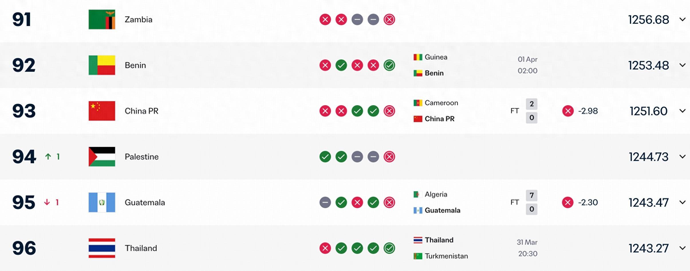 3月31日,國足在FIFA系列賽中0-2不敵喀麥隆。由於本場比賽失利國足的FIFA實時積分減少2.98分,重回第93位,上一場2-0擊敗庫拉索之後,國足曾升到過第92位。