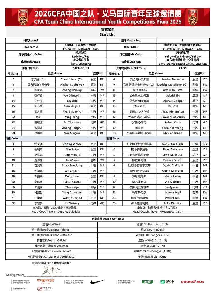 北京時間3月31日19:35,中國之隊邀請賽義烏賽,中國U19再戰澳大利亞U19,賽前雙方首發陣容公佈如下: