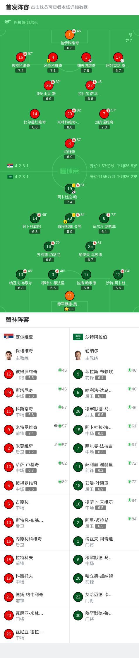 第70分鐘,反超比分!米特羅維奇頭球破門,塞爾維亞2-1沙特