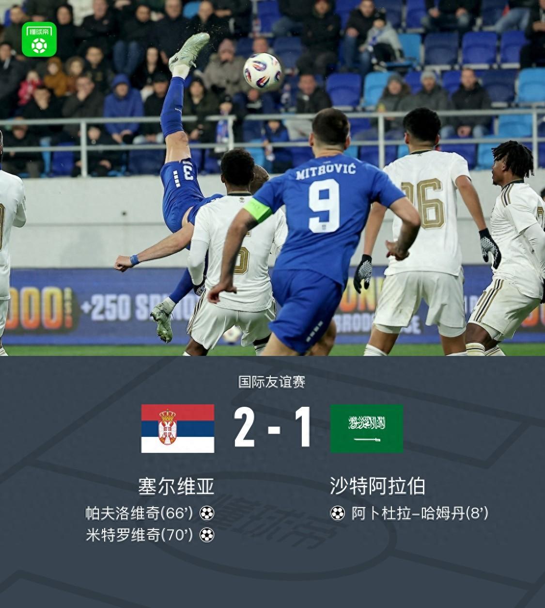 北京時間4月1日國際友誼賽,塞爾維亞對陣沙特阿拉伯。上半場哈姆丹首開記錄,下半場帕夫洛維奇倒鉤破門,隨後米特羅維奇破門反超。最終比分塞爾維亞 2-1 沙特阿拉伯。