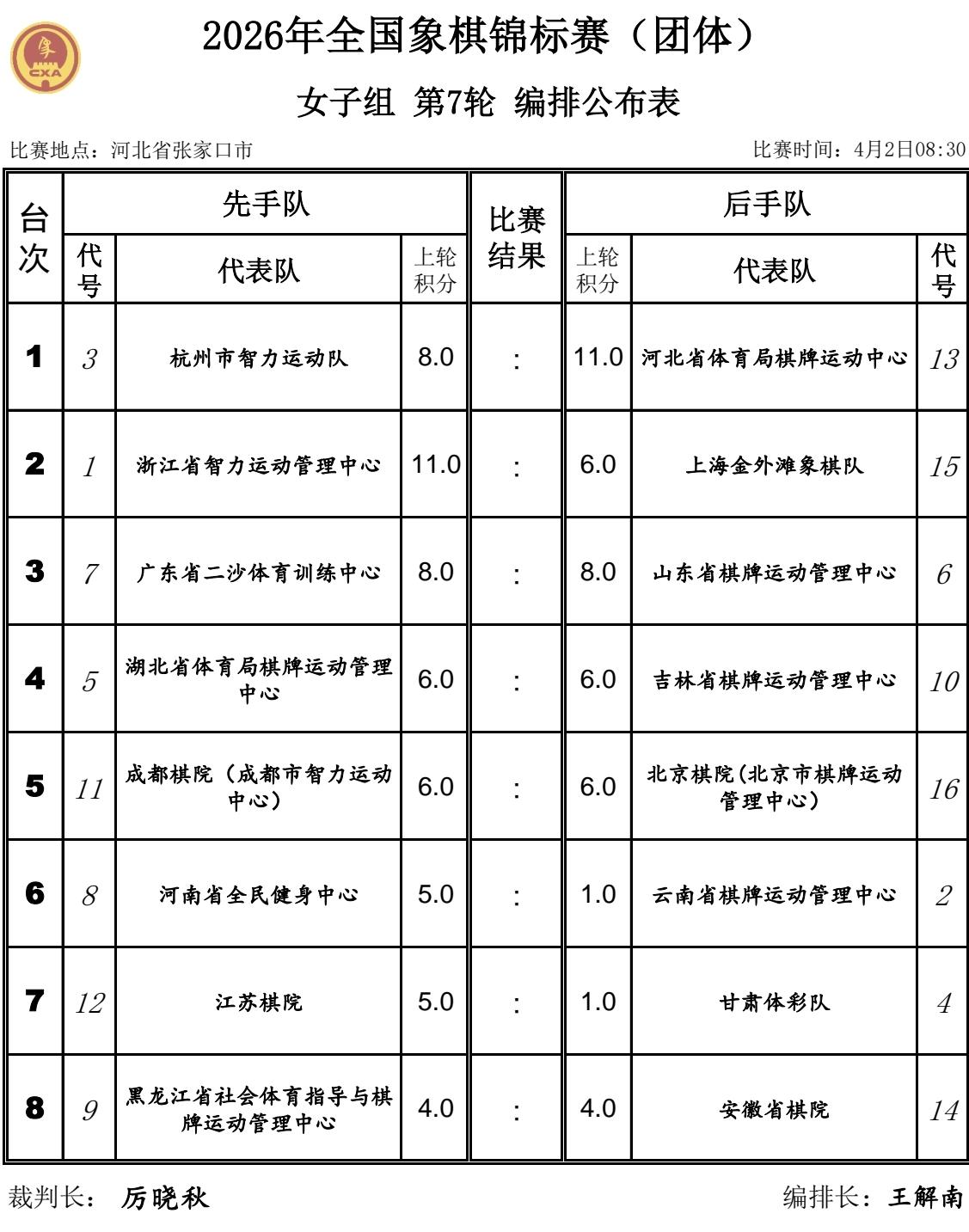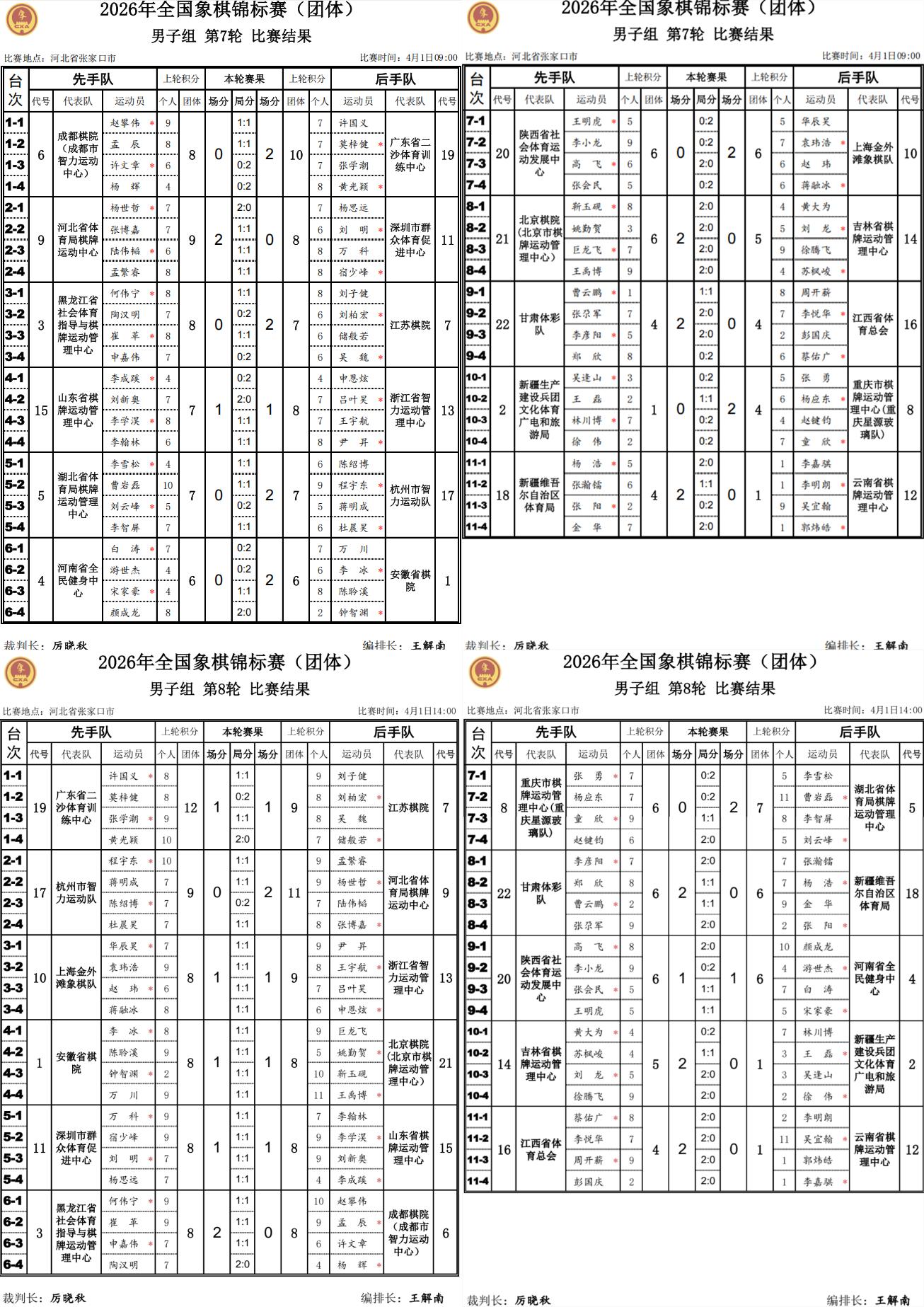 比賽是日進行男子組第7、8輪,女子組第6輪的大戰,女子組之中,兩支並駕在前的隊伍,河北隊與浙江隊,紛紛取得勝利。