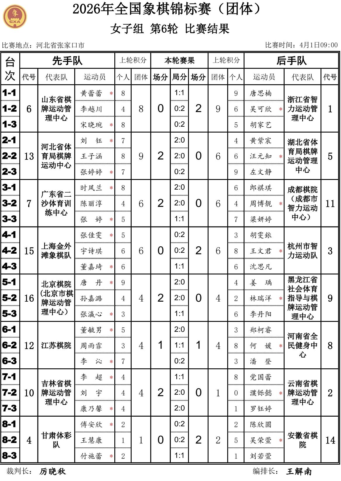 女子組六輪後,浙江、河北11分,廣東、山東、杭州8分,四川、上海、湖北、吉林、北京6分,河南、江蘇5分,安徽、黑龍江4分,雲南、甘肅1分。