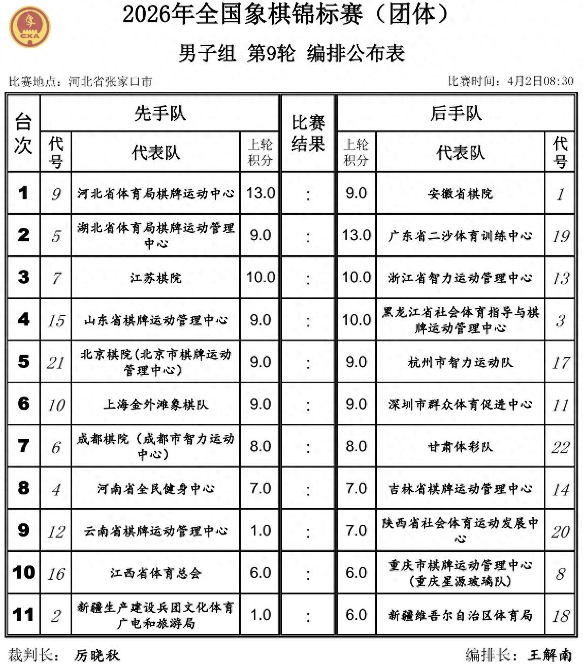 大賽4月2日上午八點半,進行本次團體賽男子組第9輪、女子組第7輪,最後一輪的大決戰,男子河北、廣東,女子浙江、河北,誰能一舉稱霸,豪取金盃,力攬王座,是東道主河北勇衝雙冠,大放光芒,還是廣東浙江強取登頂,象棋王子也將繼續進行全程的直播和報道(抖音:象棋王子),與棋友一起共見冠軍榮耀,敬請關注、支持、守護,謝謝!
