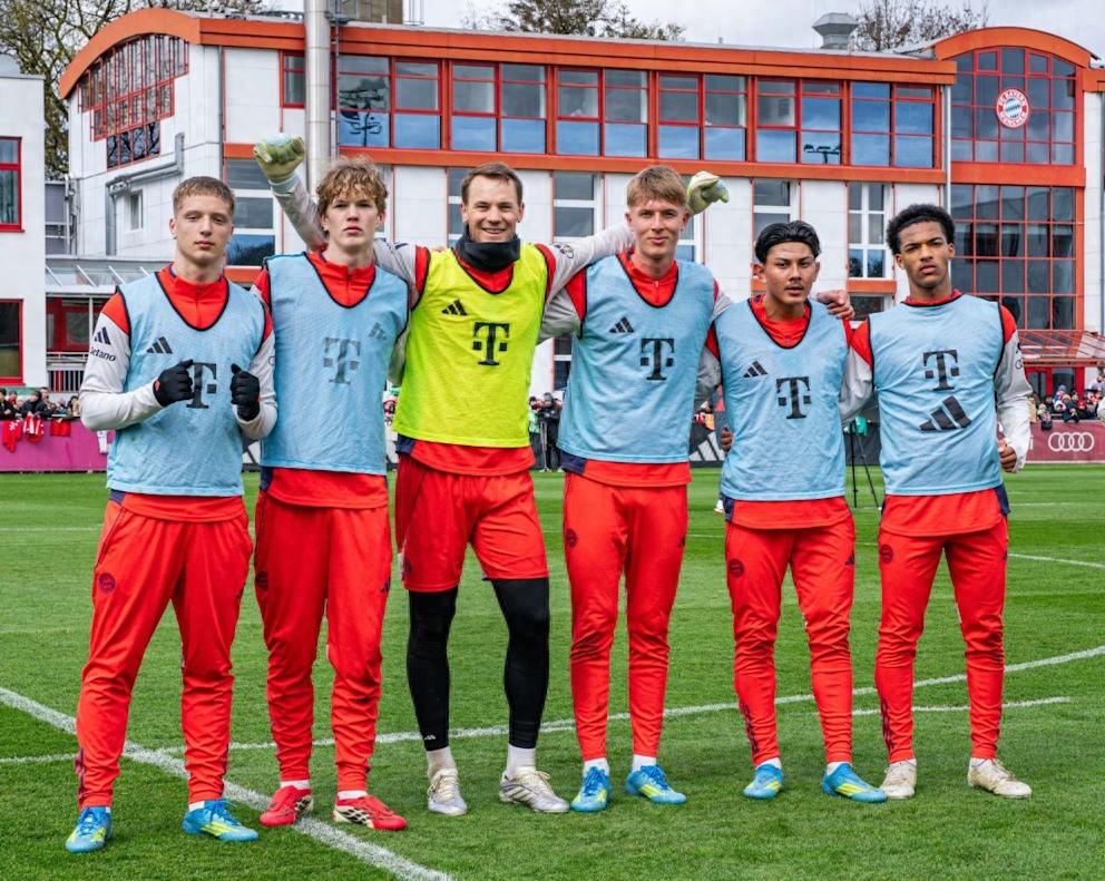 拜仁隊長諾伊爾日前在訓練結束後與5名青訓小將同框,引發外界關注。《圖片報》介紹了這5名拜仁新星的身份與背景,其中4人年僅16歲,1人18歲,拜仁近期也正持續讓更多青年才俊進入一線隊訓練。