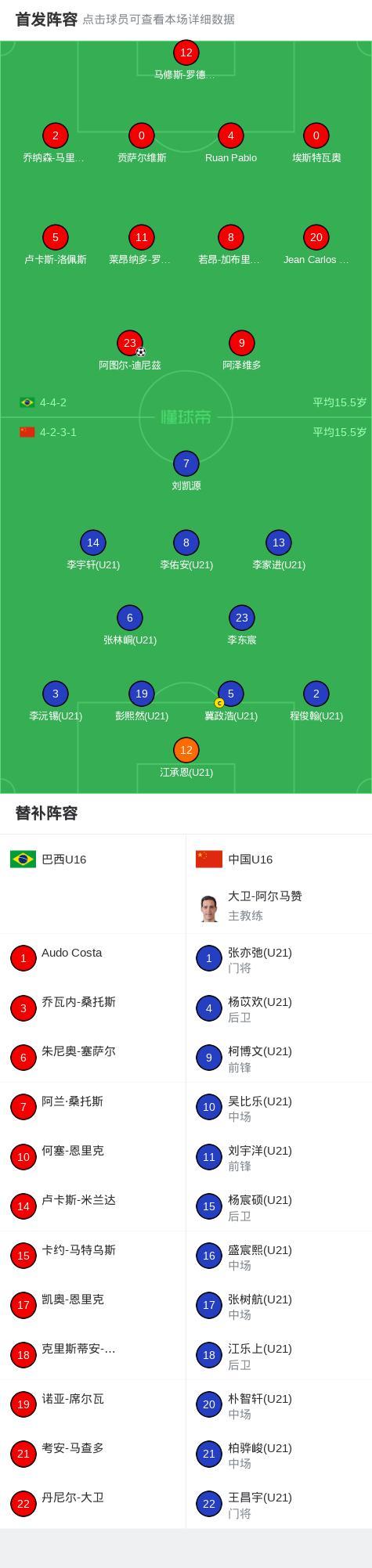 北京時間4月3日蒙太古杯U16邀請賽 小組賽 第2輪,巴西U16對陣中國U16。上半場阿圖爾-迪尼茲強勢突入禁區破門,之後李家進遠距離吊門,球被馬修斯精彩撲出。下半場劉凱源小角度射門,球被馬修斯撲出。最終U16國少0-1巴西U16將參加5-8名排位賽。