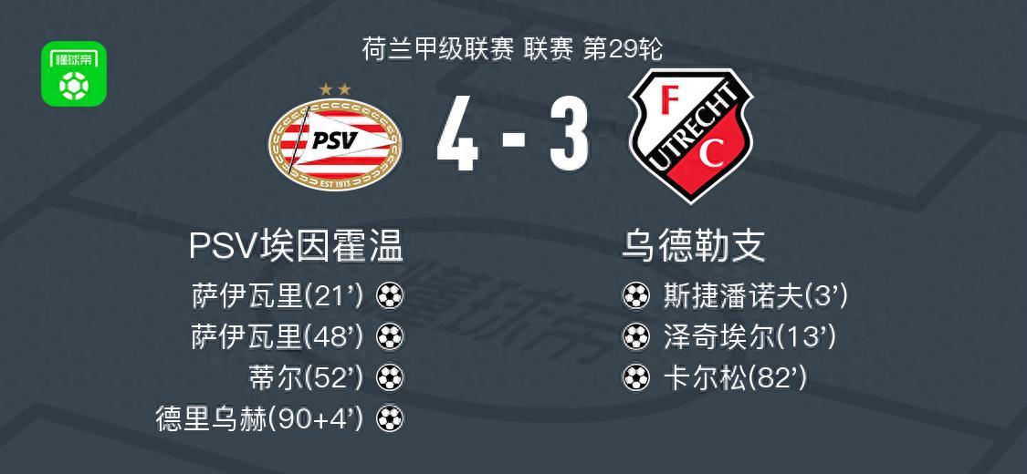 PSV埃因霍溫4-3逆轉烏德勒支,薩伊瓦里梅開二度,德里烏赫破門