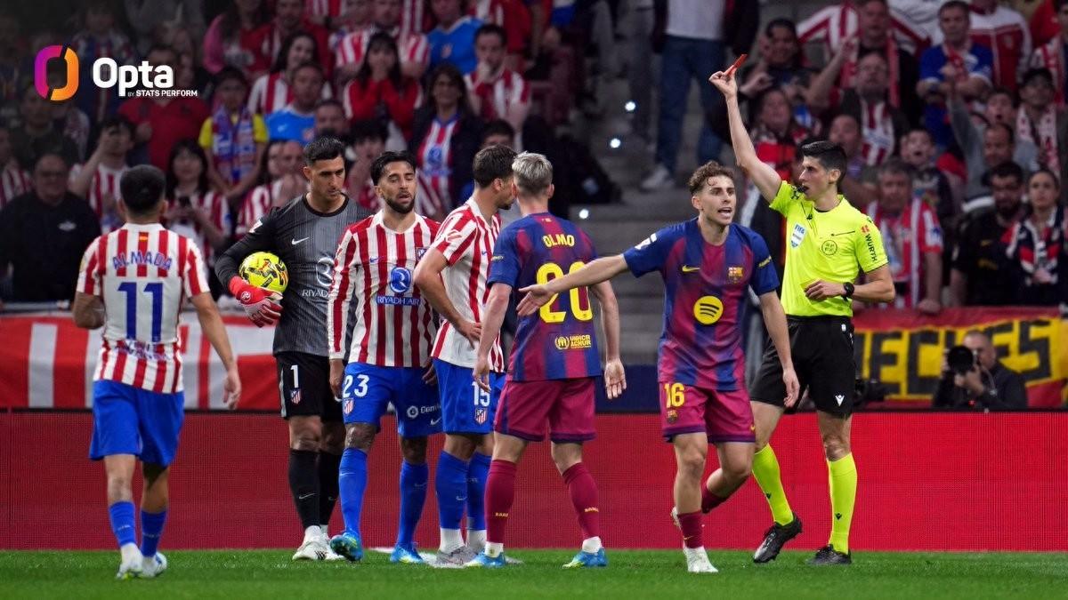 西甲第30輪,巴塞羅那客場對陣馬德里競技,上半場馬競前鋒尼古拉斯-岡薩雷斯因犯規染紅,至此,巴薩本賽季西甲已有4名對手球員在上半場被罰下,爲五大聯賽並列最多。