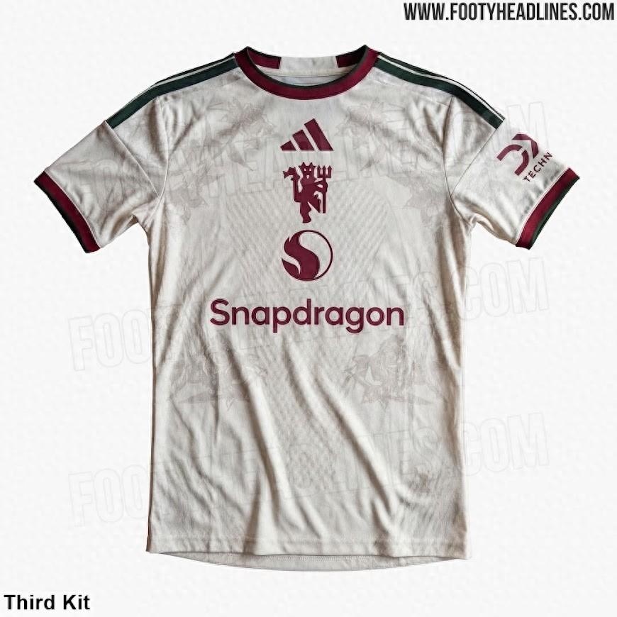 阿迪達斯爲曼聯設計的26-27賽季第三球衣以米白色爲主色調,搭配深綠色和酒紅色,雖然配色與23-24賽季客場球衣非常相似,但設計風格卻截然不同。