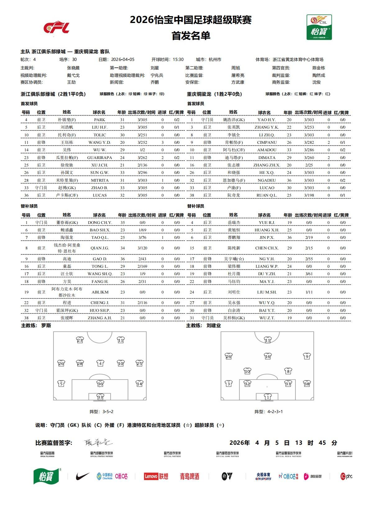 北京時間4月5日15:30,中超第4輪焦點戰,浙江坐鎮黃龍體育中心體育場迎戰重慶銅梁龍,本場主裁判爲張曉晨,VAR裁判爲戴弋戈,賽前雙方首發出爐。