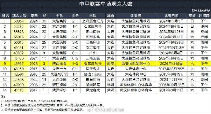 本輪聯賽陝西主場上座43937人,排中甲歷史第9;前8皆爲英博