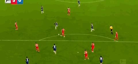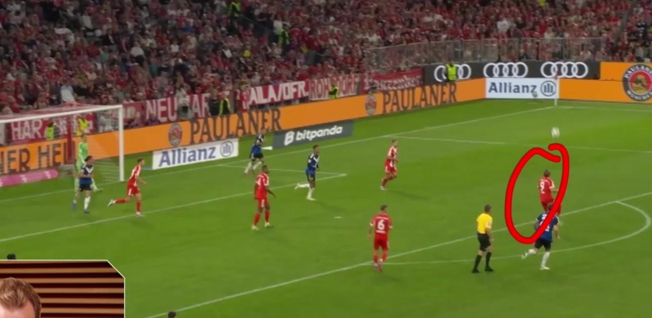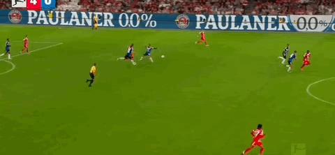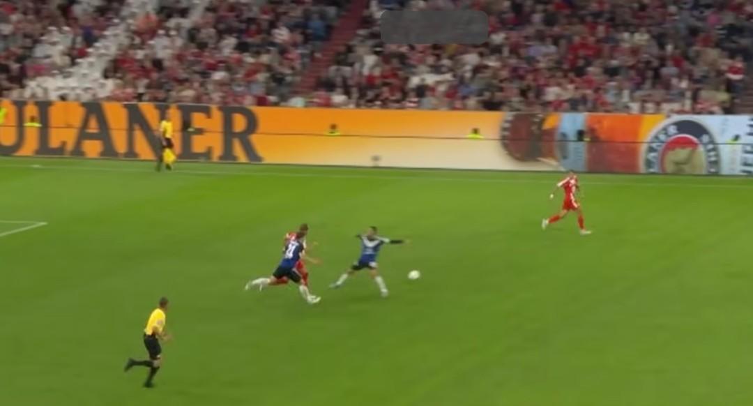 當球給到基米希時,我進入到了十號位區域。如果基米希看到我,他或許可以傳給我,但他看到了一個更好、更具前瞻性的傳球線路。所以,當球傳給這邊的迪亞斯時,我發現自己與中後衛保持着很好的距離。有時候迪亞斯可能會選擇一對一突破,而我在這裏更像一箇中場。但當停球創造出空間時,我知道如果他在這裏把球傳給我,我或許可以第一時間射門。