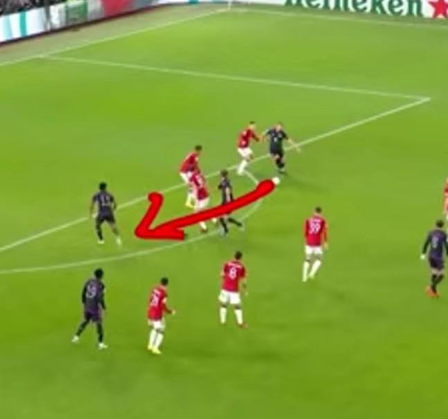 你看這裏,球來了,反彈有點幸運。顯然你必須保持警覺。從防守隊員的角度看,他其實把我盯防得相當好。但我覺得我的反應就是快了一點點。當球來的時候,我用眼角餘光看到了科曼,我知道,我不能傳到他的腳下,因爲防守隊員明顯封住了線路。所以,如果我能用外腳背把球傳進這個空當。