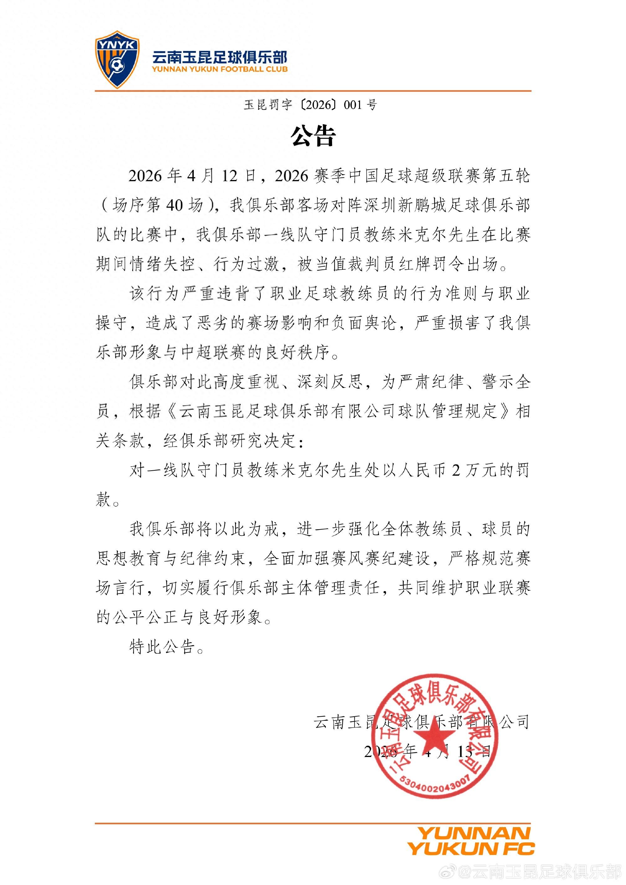 北京時間4月13日,雲南玉昆官方發佈處罰公告,對在比賽中染紅的門將教練處以2萬元罰款。