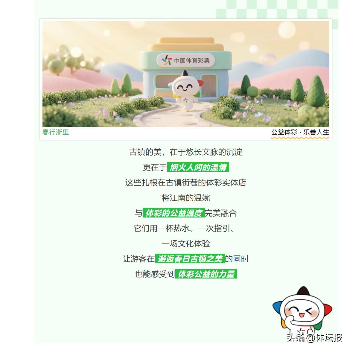 春風輕拂之江,吹醒了浙裏古鎮的千年煙火。青石板路印着春雨的痕跡,白牆黛瓦間飄着青團的清香,春日的古鎮遊,是刻在骨子裏的浪漫。在一幅幅江南水墨畫卷裏,一家家坐落在街巷中的體彩實體店,正悄然變身。它們不僅僅是體彩銷售點,而是成爲遊客旅途中的歇腳地、便民站、文化窗,用點滴善意溫暖着每一段漫遊歲月的旅程。