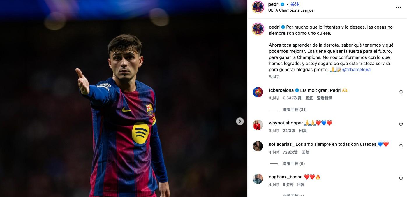 佩德里在巴薩無緣逆轉淘汰馬德里競技後發佈社媒表示,球隊必須把這次失利轉化爲未來繼續前進的動力。他強調,巴薩不會滿足於現有成績,目標依然是在未來幾年衝擊歐冠冠軍。