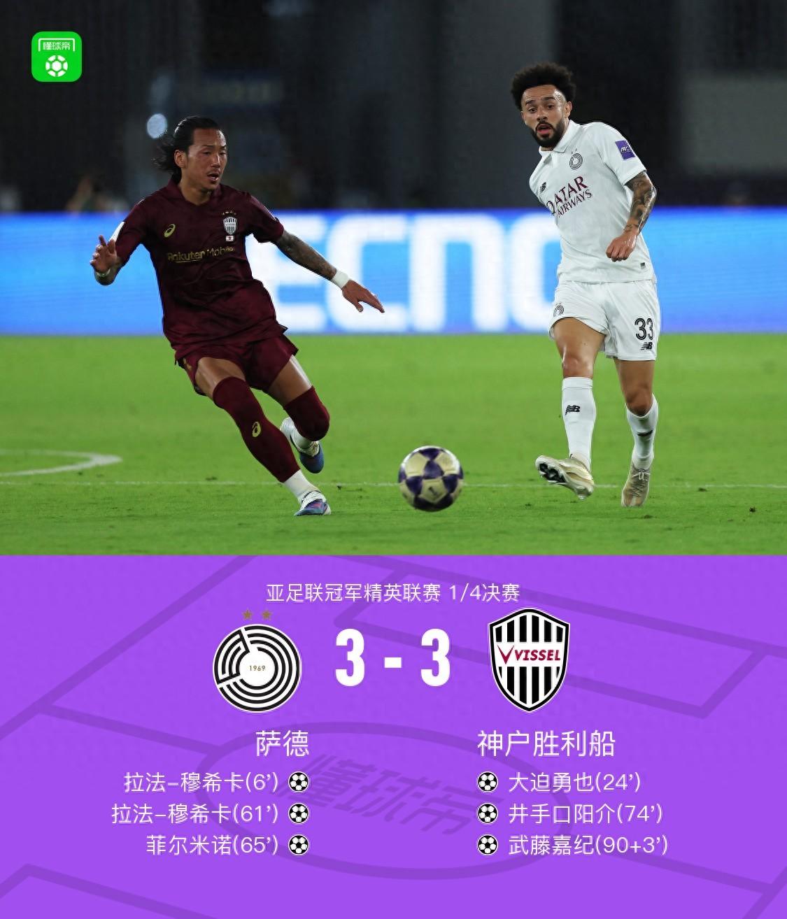 第90+3分鐘,武藤嘉紀頭槌破門絕平,雙方進入加時,薩德3-3神戶