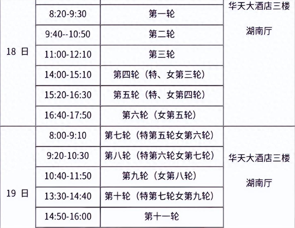 賽程18日上午八點半第1-3輪,下午兩點第4-6輪;19日上午八點第7-9輪,下午一點半,最後兩輪大決戰。