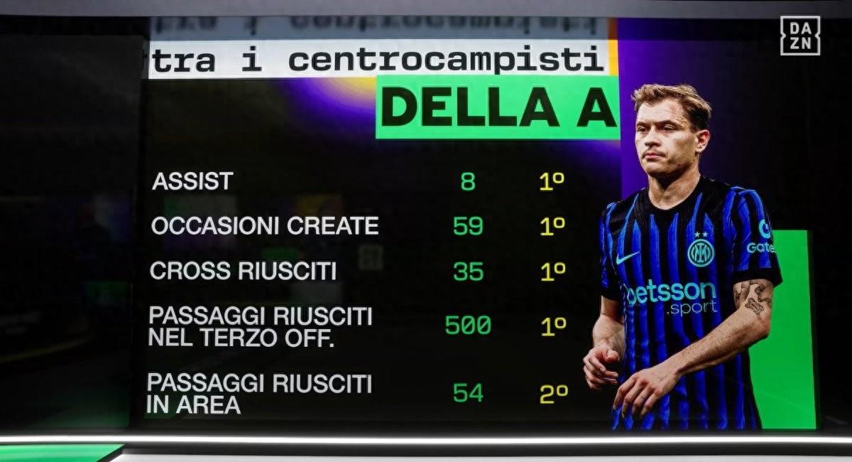 北京時間4月18日,在意甲第33輪國際米蘭主場迎戰卡利亞里的比賽開始前,DAZN列出了巴雷拉本賽季在意甲的五大數據,其中四項位列意甲所有中場的第一位,其餘一項位列第二。