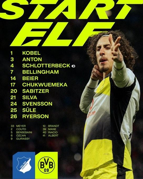 多特蒙德首發:1-科貝爾、3-安東、4-施洛特貝克、7-喬布-貝林厄姆、14-拜爾、17-丘庫埃梅卡、20-薩比策、21-法比奧-席爾瓦、24-斯文松、25-聚勒、26-瑞爾森