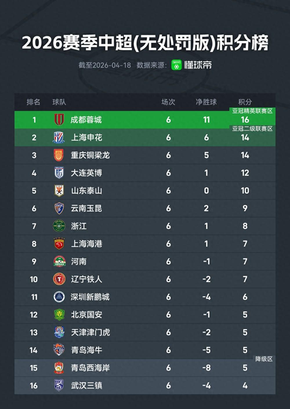 在無扣分積分榜上,前三名都收穫了開賽不敗的傲人成績。成都依然憑藉6輪5勝1平的成績高居榜首,申花和銅梁龍都收穫4勝2平,申花憑藉淨勝球優勢位居第二,銅梁龍第三。扣掉10分之後,申花在實際積分榜上目前排名聯賽第8。
