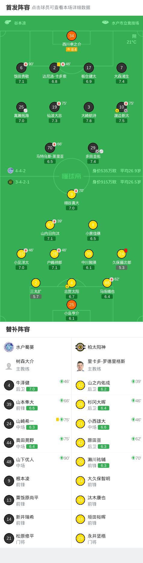 第77分鐘,水戶蜀葵主教練樹森大介不滿判罰,裁判出示紅牌將其罰出場外