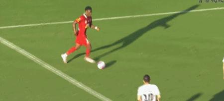 第21分鐘,右路傳中,基託抬腿攔擋,皮球正中十環痛苦跪地