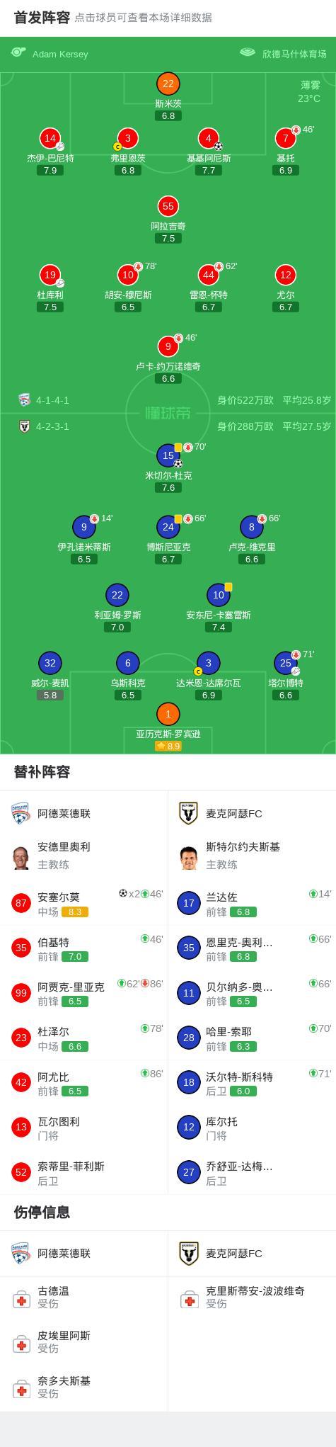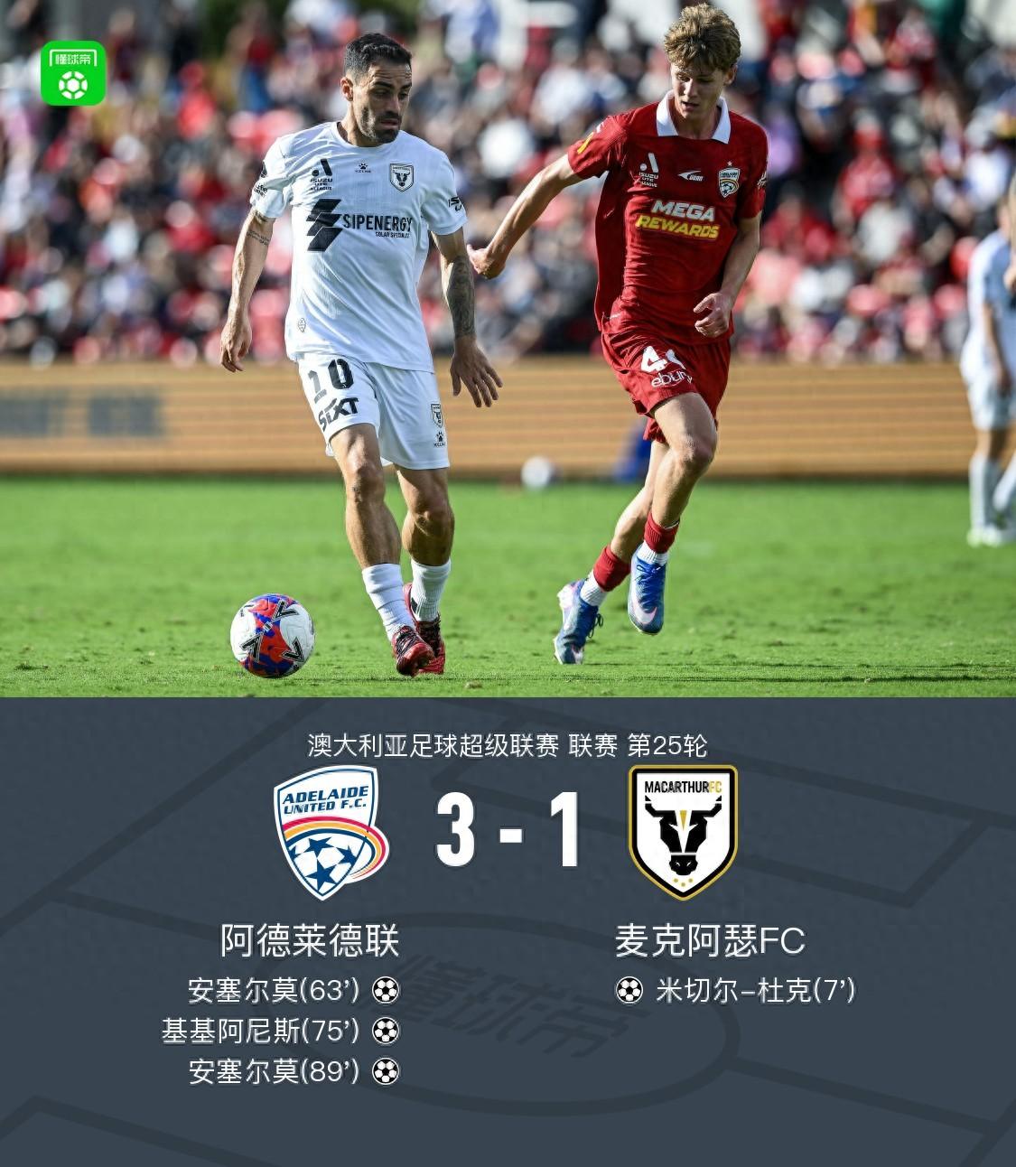 北京時間4月19日澳大利亞足球超級聯賽第25輪,阿德萊德聯主場對陣麥克阿瑟FC。比賽中,麥克阿瑟FC率先憑藉配合由米切爾-杜克打入一球;隨後阿德萊德聯通過兩次助攻安塞爾莫實現進球,同時基基阿尼斯也完成破門。最終比分阿德萊德聯3-1麥克阿瑟FC。