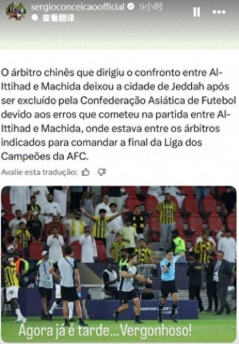 北京時間4月21日,據沙特媒體報道,馬寧因在亞冠四分之一決賽中的失誤,被取消亞冠執法資格。吉達聯合主教練孔塞桑隨後轉發了這篇報道,並評論:太遲了,真是丟人。