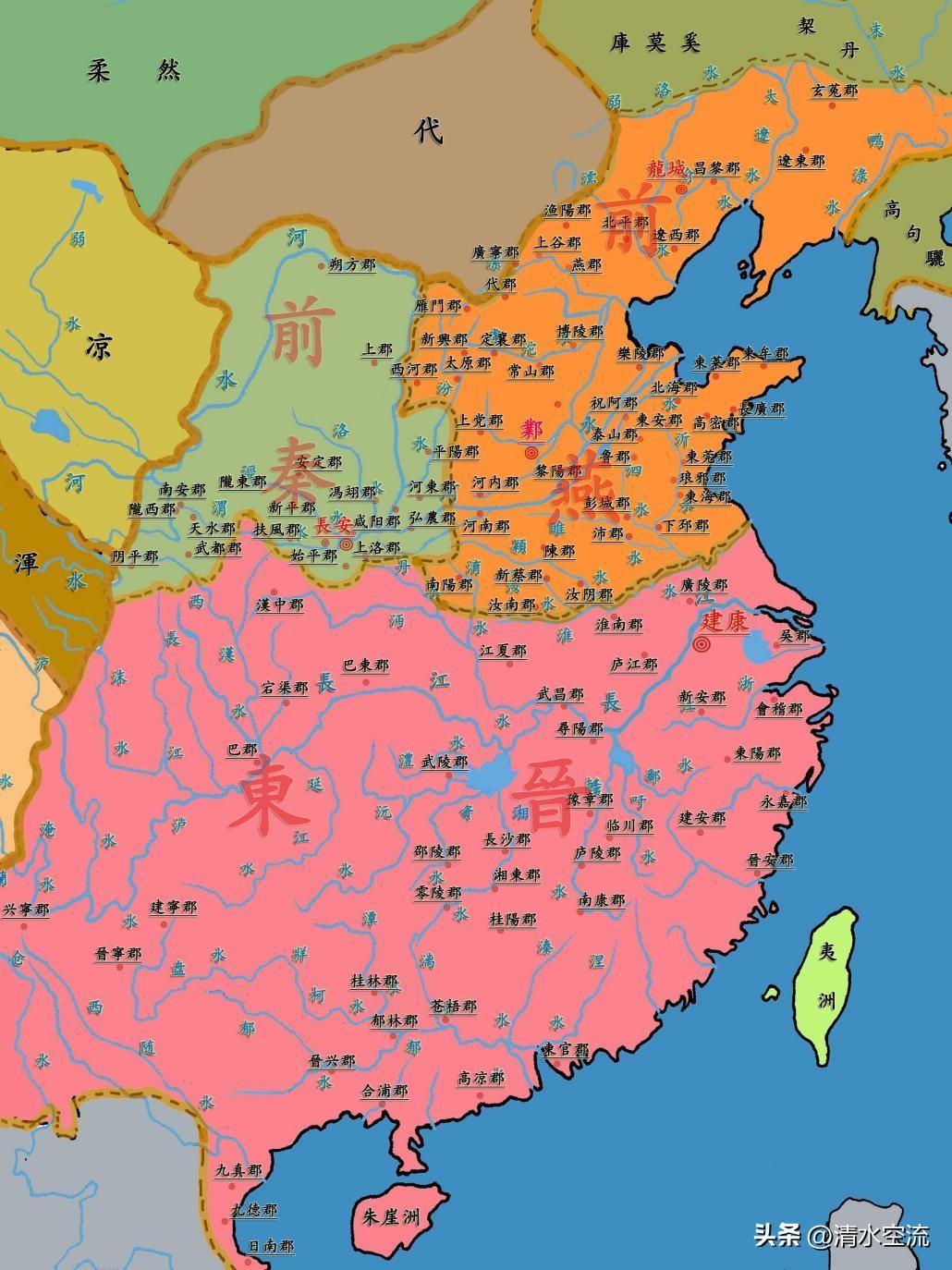 秦王掃六合,虎視何雄哉!苻氏以“秦”爲國號,既有地域上的關聯,但也意味着無須掩飾的一統天下之野心——苻堅要做第二個“嬴政”。在苻堅看來,實現南北大一統,只差東晉司馬氏盤踞的江南大地了。