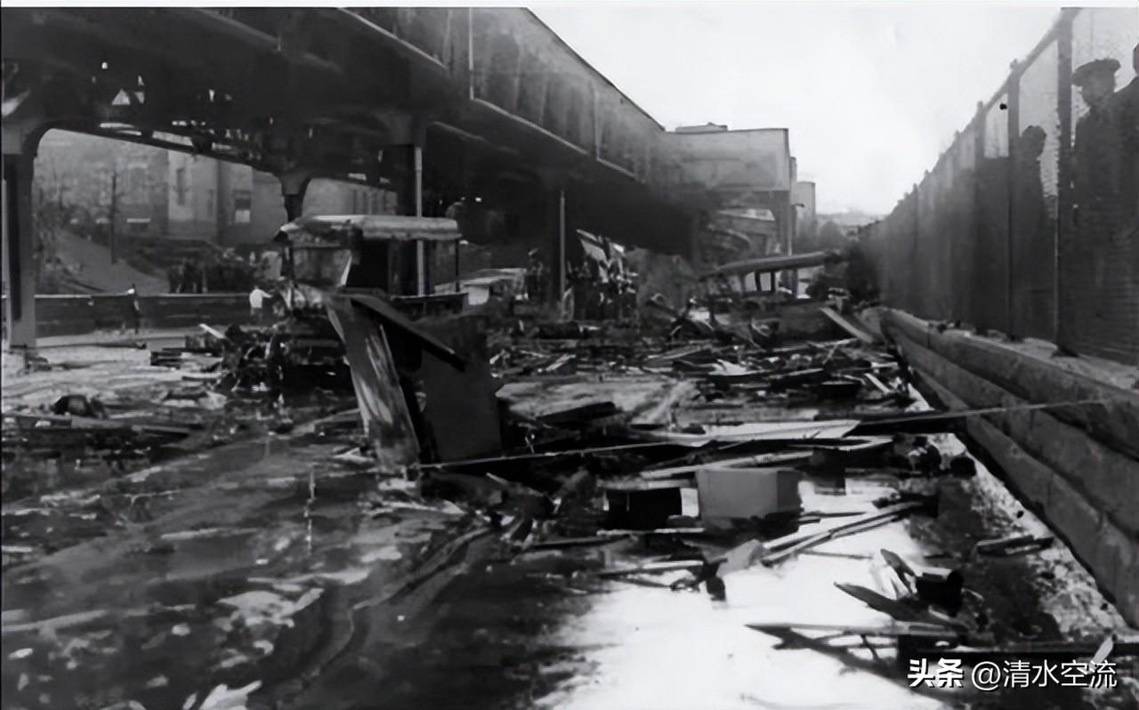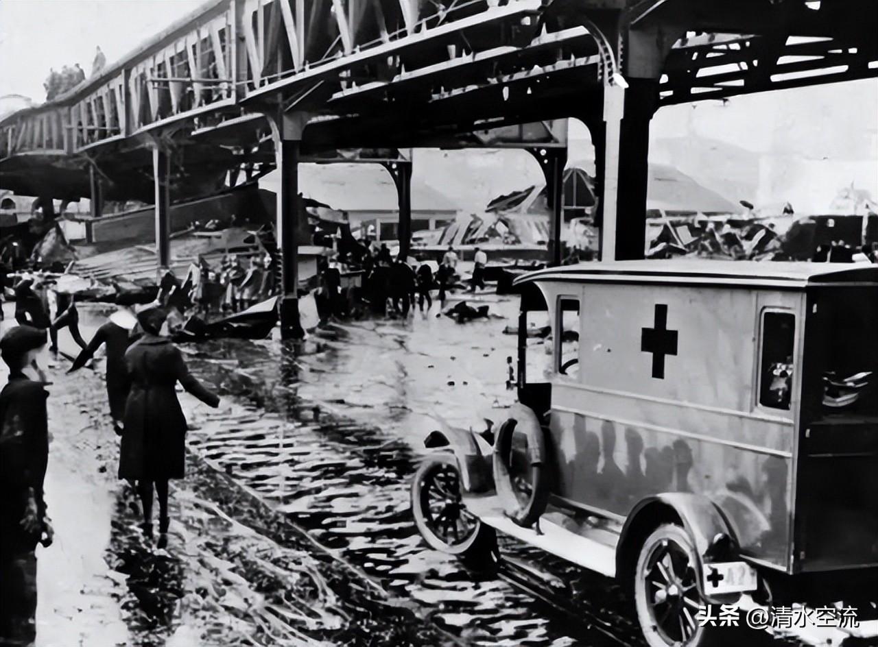 隨着罐體爆裂,數以千計的金屬釘瞬間齊飛而出,化作密集的致命子彈,狠狠釘入周遭的木質建築之中,留下了密密麻麻的“彈孔”。與此同時,一塊重達一噸的鋼板碎片猛擊高架鐵路支柱,結構瞬間崩塌。劇烈的衝擊下,行駛中的列車被狠狠掀離鐵軌,如同斷線的風箏般從高空直直摔向下方的街道。