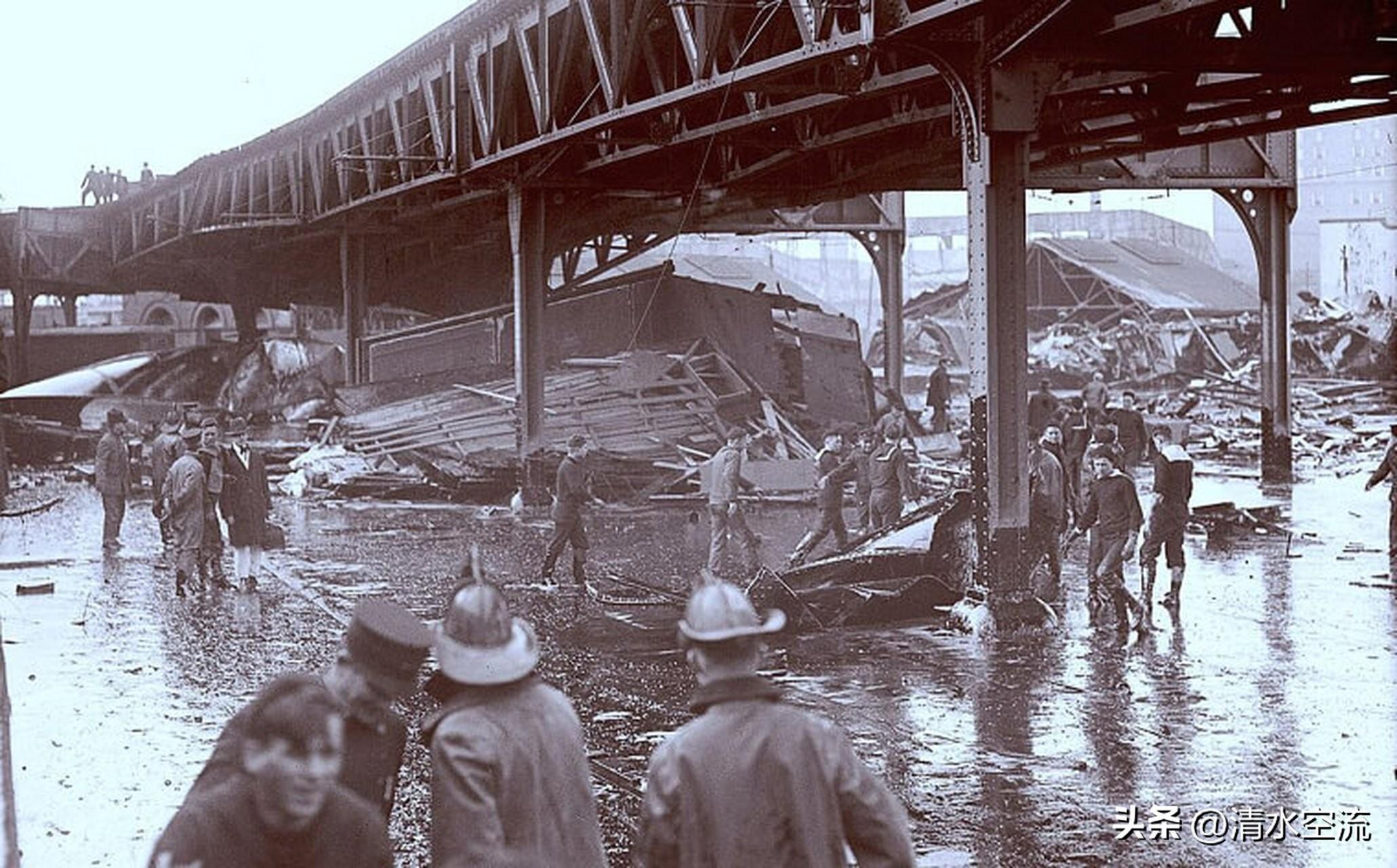 失去罐壁束縛的瞬間,濃稠的黑色洪流化作奪命狂潮,以每秒15米以上的速度撲向整條街道。它輕易推倒磚牆、震碎門窗,將重型貨車像脆弱蛋殼般狠狠壓扁。洶湧的糖蜜浪濤一路裹挾着行人、牲畜、傢俱與建築殘骸,蠻橫地衝撞、碾壓、拋擲,所過之處寸草不留。港口一座三層高的消防站,更是被巨浪從地基上生生扯離,整棟建築搖搖欲墜,險些被直接衝入大海。