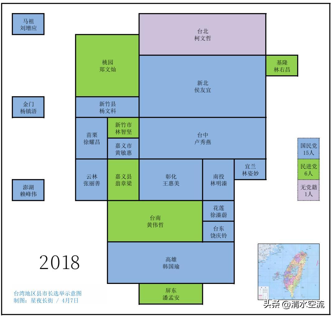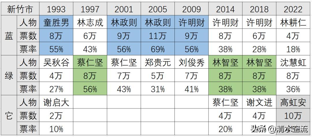新竹市現在的藍·綠·它分佈大概是35%·30%·35%。藍營、綠營、中間選民各佔1/3。但在上世紀末,新竹市的政治版圖爲藍大於綠。