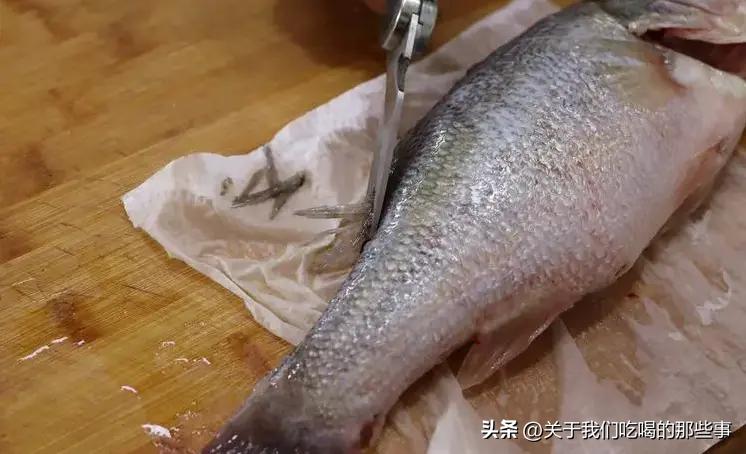 3、洗乾淨的鱸魚用清水沖洗一下,瀝乾水分。然後用菜刀沿魚脊骨兩側各劃一刀,然後在魚背兩側也各劃一刀,這樣鱸魚就可以趴在盤子裏蒸了。用廚房剪刀把魚脊骨剪成小段,這樣蒸的時候魚肉就不會收縮變形,造型更好看。如果嫌麻煩的話,也可以直接躺在盤子裏蒸。