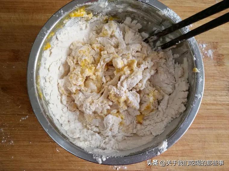 3、用筷子把麪粉、食鹽、食用鹼攪拌均勻。想要手擀麪口感筋道,就要增加蛋白質的含量,所以還要加一樣,就是雞蛋。和麪加雞蛋,不僅喫起來更筋道,而且營養也更豐富。