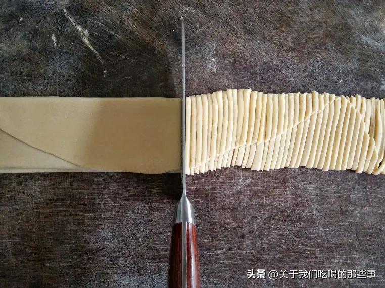 8、根據個人喜好,把面片用刀切成合適的寬度,撒上一些乾麪粉,用手抖散,這樣麪條就不會粘連了。做好的手擀麪口感筋道,不管是做湯麪、炒麪、蒸麪都很好喫。煮麪條時要開水下鍋,沒有白心後即可撈出,過一下涼水,口感更加爽滑筋道,還不會粘連。
