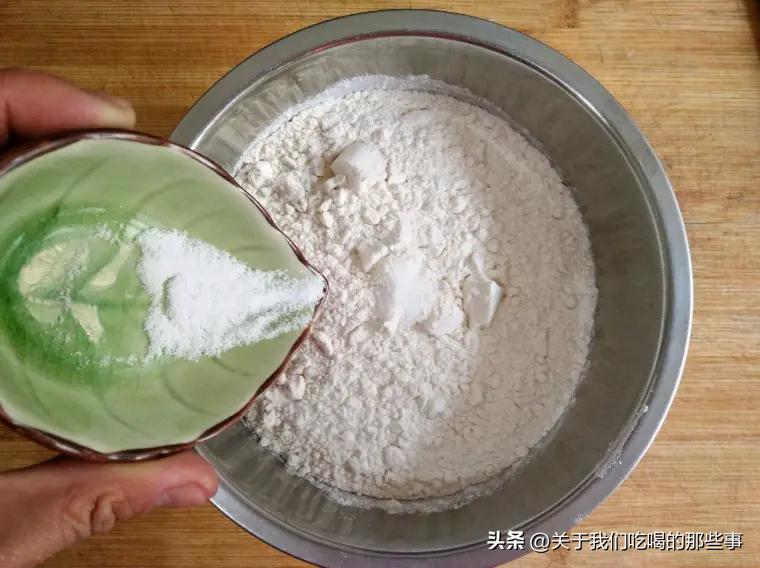 2、面盆裏倒入500克高筋粉,加入5克食鹽,還要加一樣,就是食用鹼。食用鹼可以增加麪條的彈性和韌性,手擀麪才爽滑筋道。俗話說“鹽是骨頭,鹼是筋”,做麪條不能只放鹽,食用鹼也不能少。一斤麪粉放5克食用鹼即可。