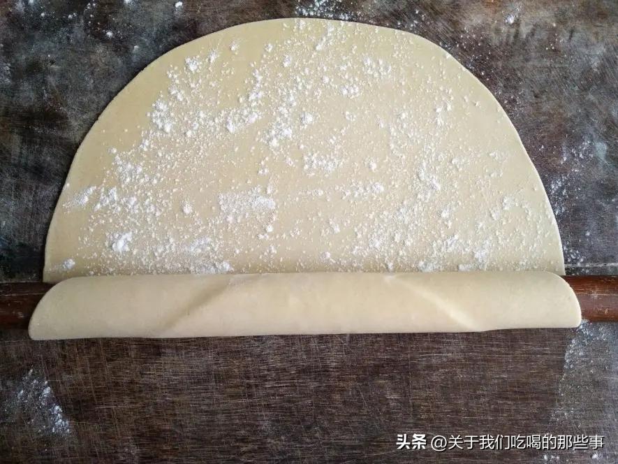 7、擀的時候要注意,在面片上撒一些乾麪粉,可以防粘。一般要擀10分鐘以上,這樣口感才筋道,等到擀到合適的厚薄後,把面片像摺扇子一樣疊起來,寬度大概10釐米左右。