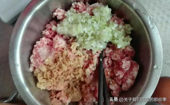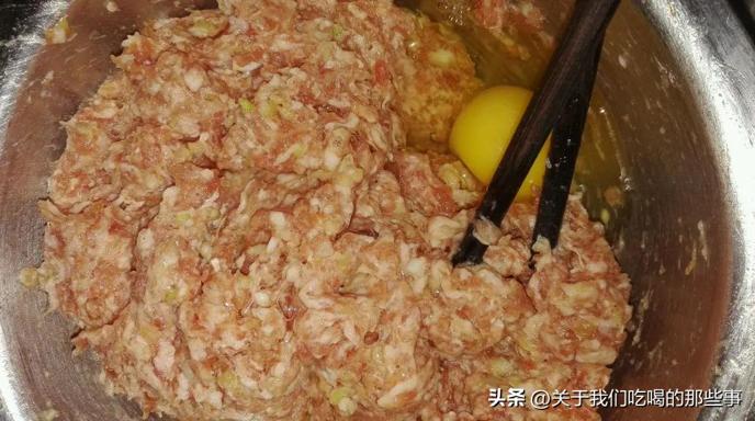 4、調肉餡不用太多調料,越多反而越不好喫,只需要簡單的幾樣調料,突出原本的肉香。把蔥薑末放入肉餡裏,加入適量食鹽、生抽、料酒、五香粉、雞精,打入一個雞蛋,用筷子攪拌均勻,直到筷子能豎起來,說明肉餡上勁了。