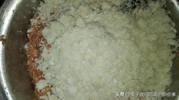 6、最後把饅頭渣倒入肉餡裏,一斤肉餡加一個饅頭就,用筷子攪拌均勻,讓肉餡和饅頭渣混合均勻,肉餡就調好了,可以開始炸丸子。