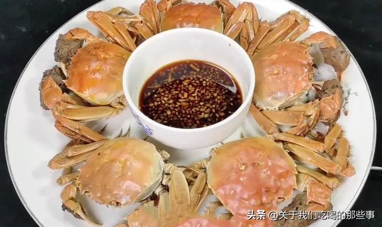 9、蒸好的螃蟹擺入盤中,旁邊放上調好的料汁,就可以喫了。螃蟹喫起來特別嫩,味道鮮美,原汁原味。