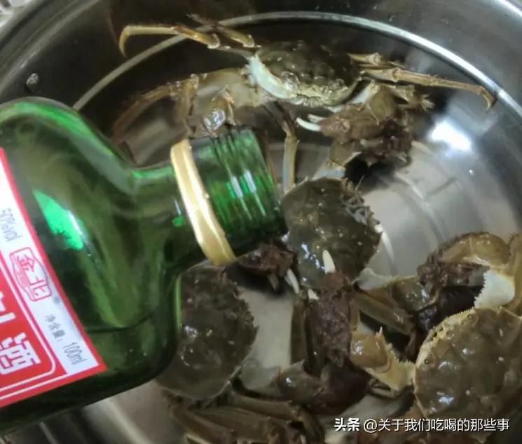 ①把螃蟹放入盆子裏,倒入適量高度白酒,浸泡10分鐘左右。白酒用五六十度的,這度數人喝了都會醉,更別說小螃蟹了,不一會兒就不動彈了。高度白酒還有殺菌、去腥的作用,蒸出來的螃蟹更鮮美。