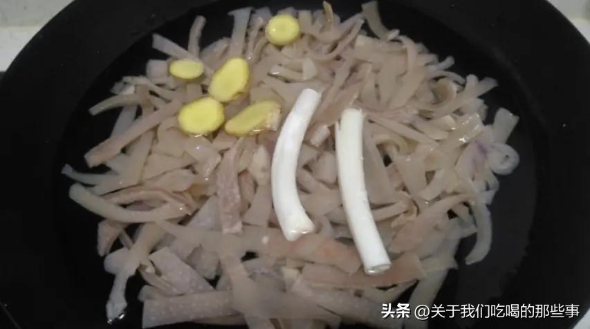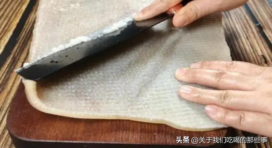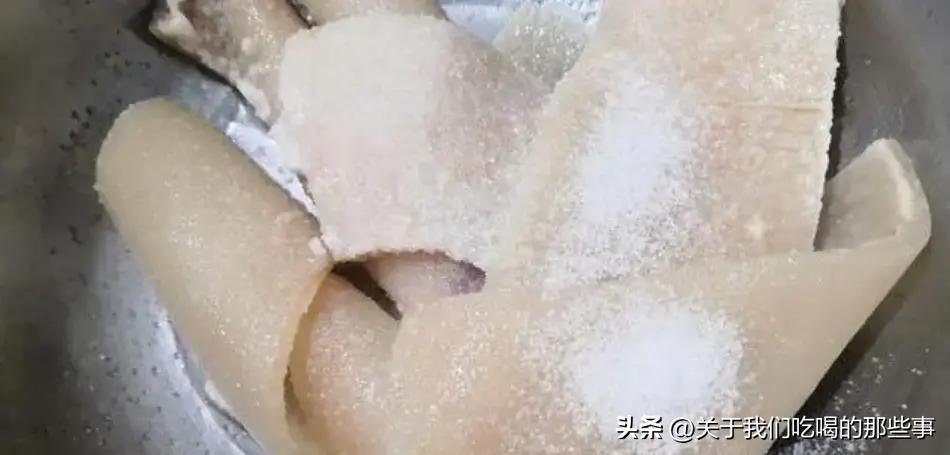 4、前面這幾步都是在處理豬皮,只有把豬皮處理乾淨後,才能做出透亮清爽的豬皮凍。很多人只是簡單地焯一下水,並沒有處理豬皮,導致煮好的豬皮凍顏色渾濁,腥味很大,一定要不好好喫。大家要記得,用食用鹼、食鹽來處理豬皮。