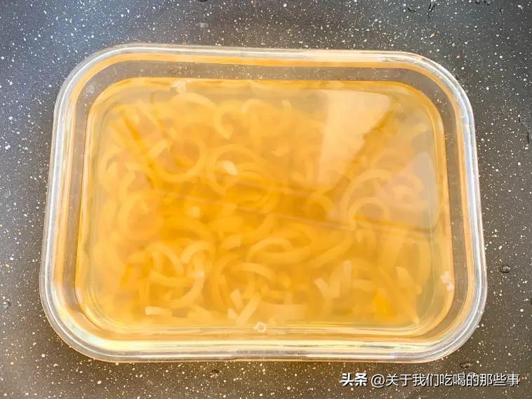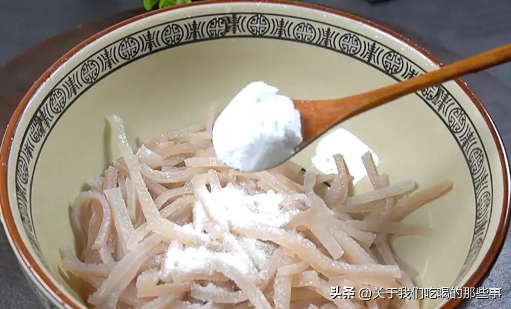 3、刮好的豬皮看不到一點油脂,很清爽,洗一下後切成細絲,放入盆子里加入一勺鹽,用手揉搓一會兒。多加2個料,第二個就是食用鹼,用食用鹼洗豬皮,可以進一步去除豬皮上的油脂,確保豬皮凍顏色透亮。等到水變清澈就可以了,撈出豬皮瀝乾水分。
